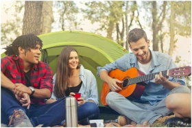 Group of friends having fun and playing guitar while camping in summer.