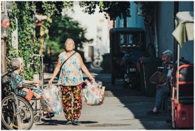 An elderly East Asian woman walks through a Beijing street carrying recyclables, showcasing urban life.