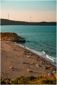 A coastal view in Kırklareli, Türkiye, featuring a busy beach and wind turbines under clear skies.