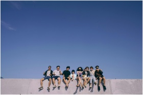 A diverse group of friends sitting on a wall under