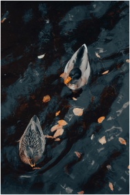 Two ducks gracefully swimming amidst floating autumn leaves on a serene lake.
