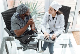 Two doctors discussing patient care using a laptop