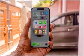 Close-up of a hand holding a smartphone showing various social media apps outdoors.
