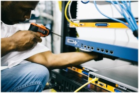 Side view crop concentrate African American male mechanic in jeans and white shirt using screw gun while working with hardware