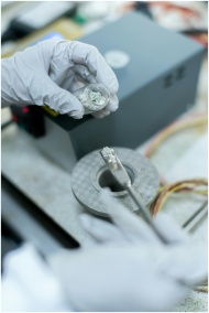 Close-up of a scientist handling metal samples in