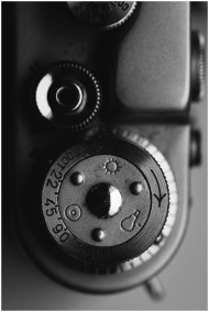 Detailed black and white close-up of vintage camera dials showcasing old-fashioned technology.