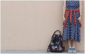 Stylish woman in a patterned dress and sneakers standing with a floral backpack against a neutral wall.