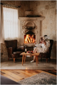 A cozy relaxation spot by the fireplace in a Turkish hotel room with a wine setup.