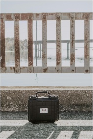 A black hard-shell suitcase placed near a rusty bridge with water in the background, ideal for travel themes.