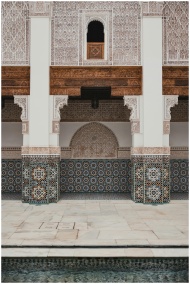 Captivating view of Ben Youssef Madrasa's intricate Islamic art in Marrakesh, Morocco.