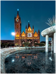 Stunning night photograph of a cathedral in Guadalajara with illuminated facade and a reflective fountain foreground.