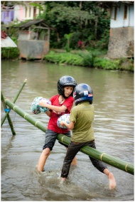 Two children having a playful pillow fight on a bamboo pole over a river in Kota Tasikmalaya, Indonesia.