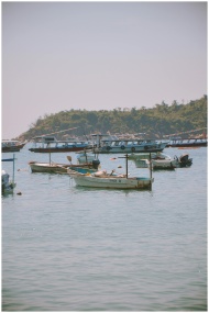 Peaceful coastal scene featuring anchored fishing