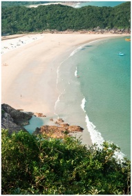 Peaceful aerial view of a secluded beach with lush greenery and clear blue waters.