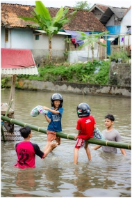 Children with helmets play on bamboo in a canal, enjoying traditional games in an Indonesian village setting.