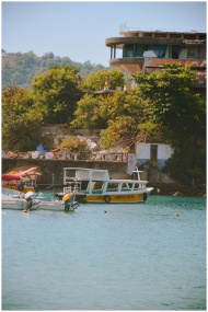 Scenic view of colorful boats docked by a lush tropical hillside on a sunny day.