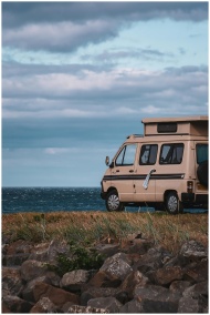 A charming campervan parked by the tranquil sea al