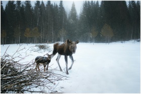 A moose and its calf wander through a snowy forest showcasing winter wildlife.