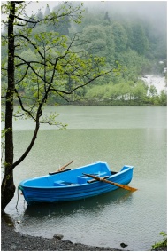 A serene blue boat moored on a tranquil lake in Artvin, Türkiye, surrounded by lush greenery.