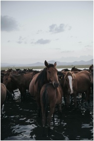 A picturesque herd of wild horses standing in shal