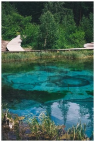 A beautiful scenic view of a boardwalk crossing clear turquoise waters amidst a lush green forest.