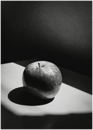 Artistic black and white still life photography of an apple with dramatic lighting.