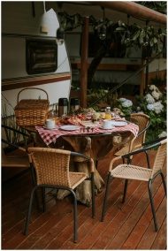 Cozy outdoor breakfast setting with wicker chairs