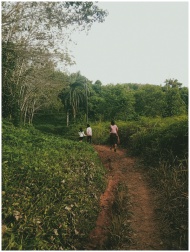 Three people strolling a winding path through a vibrant and green landscape, depicting serenity and nature.