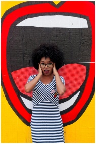 Stylish woman with afro hair poses against a colorful, artistic mural in a striped dress.