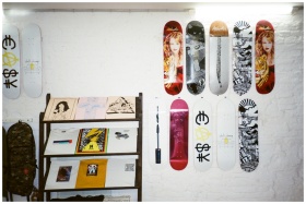 A collection of artistic skateboards and prints displayed on a white brick wall, showcasing modern art and design.