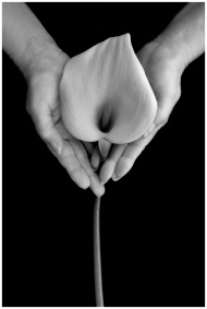 A black and white photo of hands gently cradling a calla lily against a plain black background.