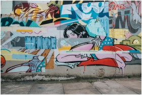 Vibrant street art mural featuring comic style ele