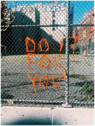 Chain link fence with orange yarn spells out 'Do It For You' in New York City.