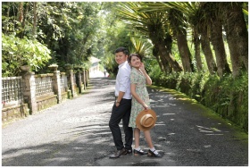 A couple playfully peeks from a traditional Chines
