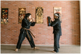 Two martial artists engage in training within a dojo setting, focusing on technique.