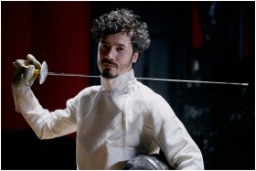Confident male fencer posing in full fencing gear indoors, holding a foil sword.