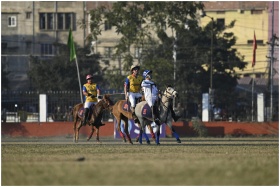 Capturing a traditional polo match in Imphal, Manipur, India with players on horseback.