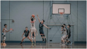 A dynamic indoor basketball game scene featuring players in action with a jump shot attempt.