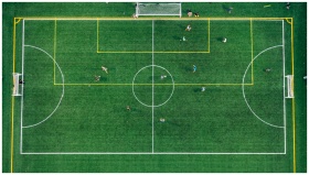 High aerial view of a soccer field with players du