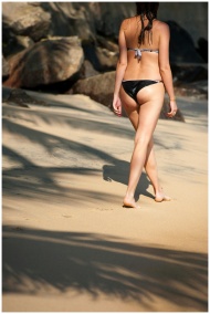 Rear view of a woman walking on a sunny tropical beach in Unawatuna, Sri Lanka.