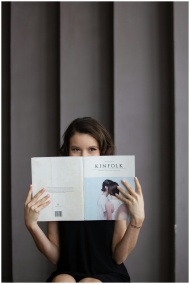 Young woman reading Kinfolk magazine against a grey wall. Indoor setting, vertical shot.