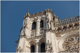 A detailed view of the ornate Gothic architecture of the Amiens Cathedral tower against a clear blue sky.