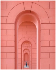 Person walking through a series of vibrant pink arches in Leipzig.