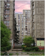 Residential apartment buildings framed by greenery in Belgrade, Serbia during a vibrant sunset.