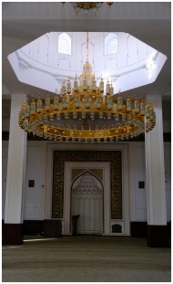 Elegant mosque interior featuring a large, intricate chandelier with Islamic architectural elements.