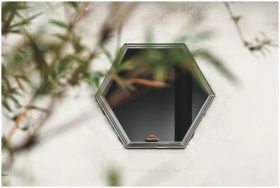 A hexagonal window on a white wall with blurred branches in foreground.