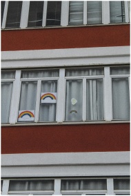 Vibrant rainbow drawings decorate apartment building windows, adding color to the urban scenery.
