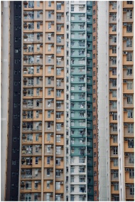 Close-up of tall residential skyscrapers showcasing Hong Kong's dense urban housing.