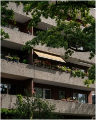 Modern residential building with balconies adorned with flowers and summer greenery.