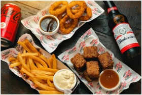 An appetizing assortment of fried foods with soft drinks, perfect for a casual meal.